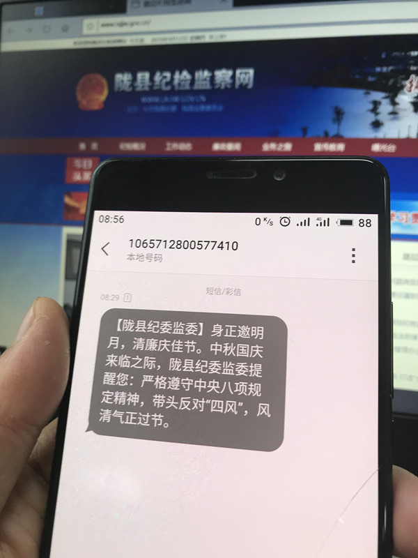 今年以来陇县纪委监委坚持把“第一种形态”牢牢抓在手上,充分利用手机短信、微信宣传覆盖面广、警示效果好的特点,将发送廉洁短信作为对党员干部廉洁提醒教育的有效手段,在节假日等重要节点,向全县党员干部早发信号,早打招呼,早提要求,将“指尖上的廉洁提醒”变为常态化。今年截至目前,陇县纪委监委共向全县党员干部发送各类廉政提醒短信、警示微信40000多条。这些小小的提醒短信进一步增强了廉政教育的渗透力,是党员干部时刻保持清醒,自觉遵规守纪,起到了显著的警示教育、监督预防作用。